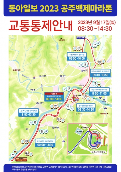 시는 대회가 시작되는 공주 시민운동장 주변은 오전 8시 30분부터 오후 2시 30분까지 차량 운행을 통제하고 공주생명과학고등학교 사거리와 의당면, 금강교 사거리는 오전 8시 50분부터 오전 11시까지 일부 구간을 통제하는 등 구간별 탄력적으로 제한한다.
