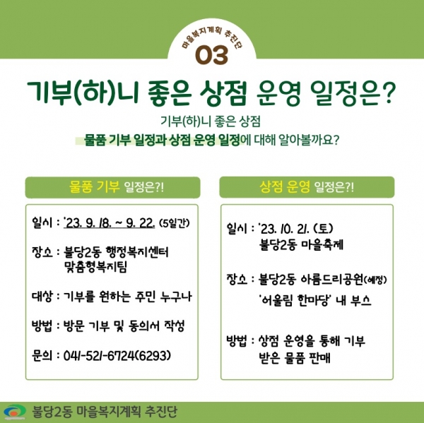 상점은 10월 21일 불당2동 마을 축제 부스에서 문을 열 예정으로 18일부터 22일까지 5일간 불당2동 행정복지센터 맞춤형복지팀에서 기부 물품을 접수한다.