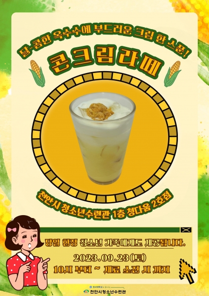 [세종타임즈] 천안시청소년수련관 청다움 2호점 서포터즈는 오는 23일 특별메뉴 ‘콘크림라떼’를 출시하고 이벤트를 진행한다고 밝혔다.