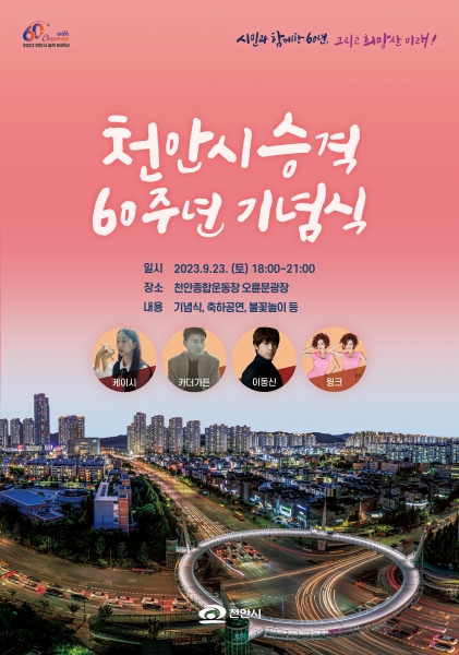 ‘시민과 함께한 60년, 그리고 희망찬 미래’를 주제로 열리는 천안시 승격 60주년 기념식은 1부 식전공연과 2부 공식행사, 3부 축하공연·불꽃놀이로 나뉘어 진행된다.