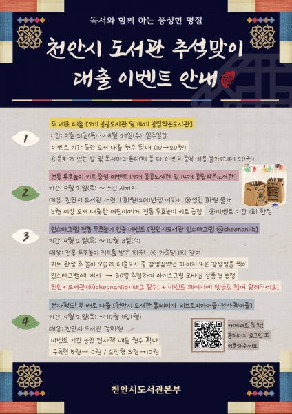 [세종타임즈] 천안시도서관본부는 추석을 맞아 시민들이 독서와 함께 풍성한 연휴를 보낼 수 있도록 다양한 대출 이벤트를 운영한다고 21일 밝혔다 이번 행사는 천안시 8개 공공도서관과 14개 공립작은도서관 도서 대출자를 대상으로 하며 대출 권수를 최대 20권까지 늘려주는‘두배로 대출’을 비롯해 어린이 대출자를 위한‘전통투호놀이 키트 증정’, ‘전자책 대출 권수 확대’ 등 다채로운 행사로 운영된다.