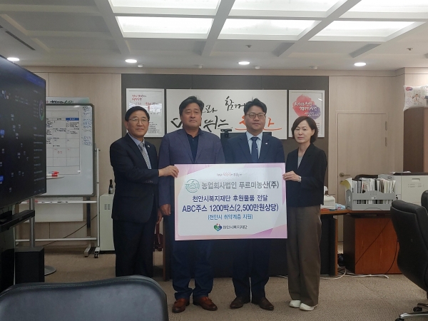 [세종타임즈] 농업회사법인 푸르미농산은 25일 퓨어미그대로 ABC주스 1,200박스를 천안시복지재단에 전달하고 천안시청 부시장실에서 전달식을 개최했다.