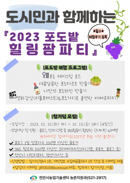 [세종타임즈] 천안시농업기술센터는 도시민과 함께 포도밭으로 떠나는 여행 ‘2023 포도밭 힐링 팜파티’ 참가자 60명을 모집한다고 4일 밝혔다.