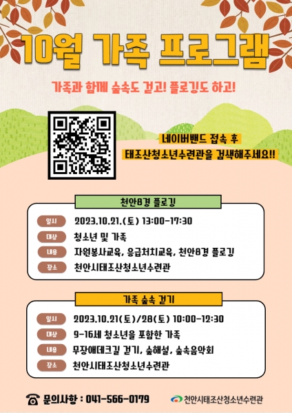 [세종타임즈] 천안시태조산청소년수련관은 가을을 맞이해 가족과 함께 참가할 수 있는 프로그램 ‘천안 8경 가족 플로깅’, ‘가족 숲속 걷기’참가자를 모집한다.