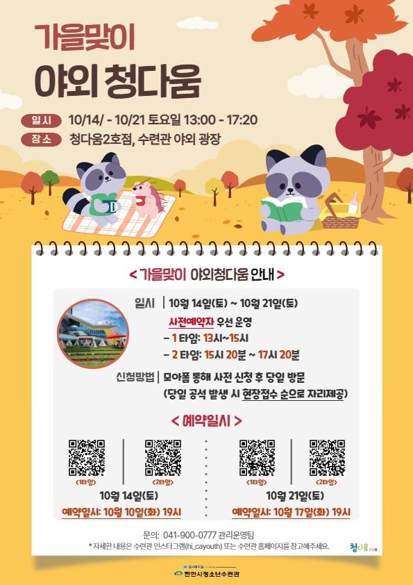 10월 14일과 21일 각각 2회차씩 운영되는 야외청다움은 사전예약 및 현장접수를 받을 예정이다.