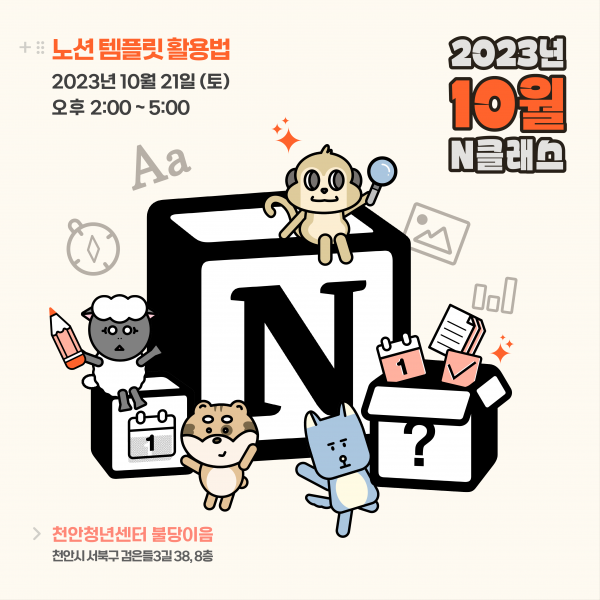 [세종타임즈] 천안시는 천안청년센터 이음에서 진행하는 10월 엔 클래스 ‘노션 템플릿 활용’ 교육에 참여할 18세 이상 39세 이하 천안 청년들을 오는 18일까지 모집한다고 밝혔다.