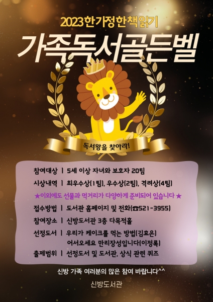 신방도서관 관계자는 “한 가정 한 책 읽기 사업의 일환인 가족독서골든벨 프로그램 참여를 통해 가족 간의 추억을 쌓고 독서 활동에 대한 즐거움을 경험할 수 있는 계기가 되길 바란다”고 전했다.