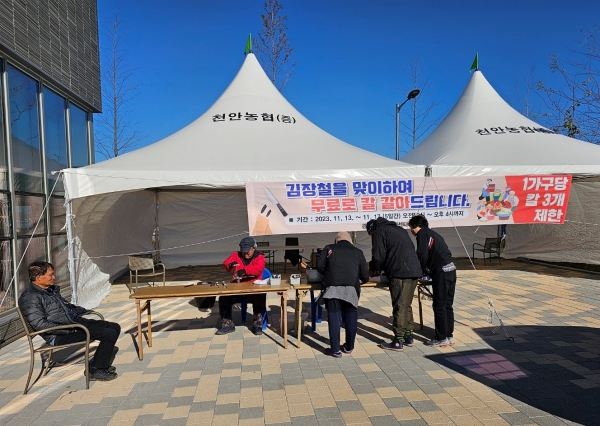 송재오 광덕면장은 “지난달 10월 천안호두축제 칼 갈아주기 봉사를 진행했는데 주민들의 호응이 좋아 김장철을 맞아 추가로 실시하게 됐다”고 밝혔다.