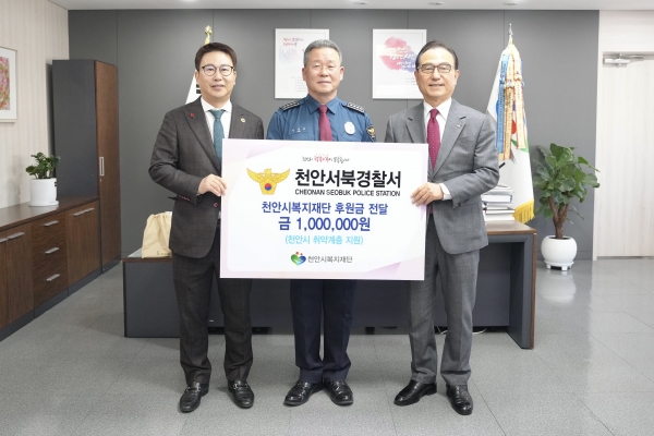 [세종타임즈] 천안서북경찰서가 지난 14일 천안시 취약계층 지원을 위해 후원금 100만원을 천안시복지재단에 전달했다.