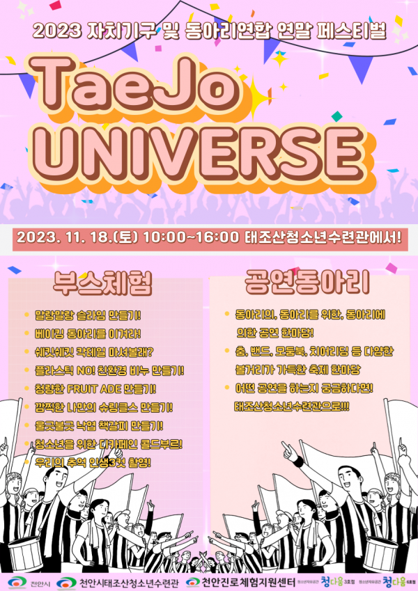 [세종타임즈] 천안시태조산청소년수련관은 오는 18일 수련관에서 청소년 자치기구 및 동아리연합 연말페스티벌 ‘Taejo Universe’를 개최한다.