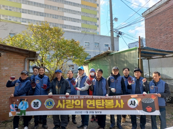 이날 천안삼거리라이온스클럽 회원 15명은 겨울철 난방에 어려움을 겪고 있는 중앙동 취약계층 홀몸어르신 두 가정에 연탄 400장을 지원했다.
