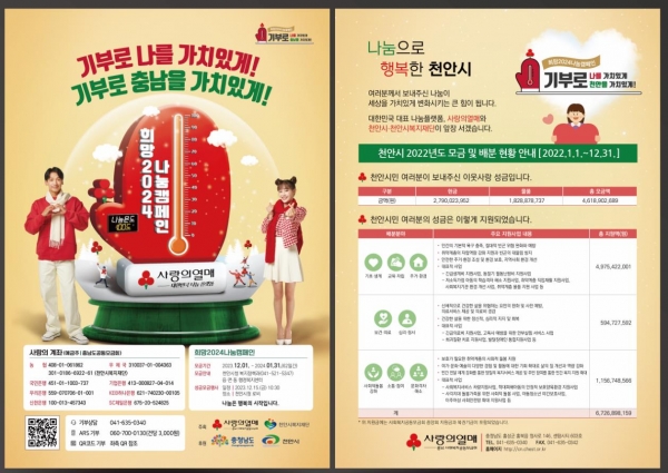 [세종타임즈] 천안시와 충남사회복지공동모금회가 12월 1일부터 내년 1월 31일까지 62일간 이웃돕기 모금운동 ‘희망 2024 나눔캠페인’을 진행한다고 28일 밝혔다.