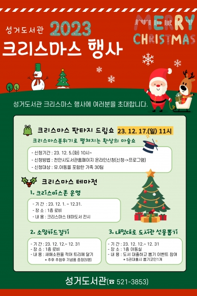 [세종타임즈] 천안시 성거도서관은 12월 연말을 맞아 시민에게 즐거운 추억을 만들어 주고자 크리스마스 행사를 운영한다고 30일 밝혔다.