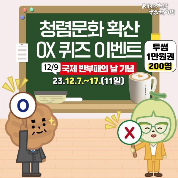 이번 이벤트는 부패행위를 척결하기 위해 유엔이 제정한 날인 ‘국제 반부패의 날’을 맞아 청렴에 대한 지식과 인식을 천안시민과 함께 공유하고자 추진됐다.
