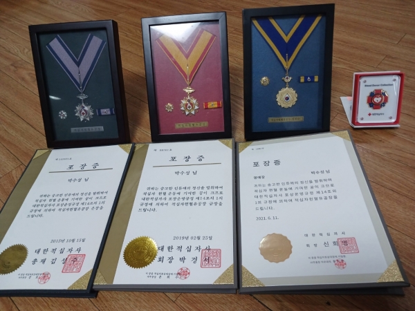 그는 헌혈로 받을 수 있는 훈장인 헌혈 유공 은장, 금장, 명예장을 받았다.