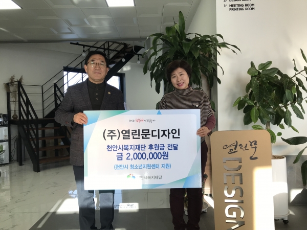 [세종타임즈] 열린문디자인은 27일 천안시 청소년의 건강한 성장을 위해 사용해달라며 후원금 200만원을 천안시복지재단에 기부했다.