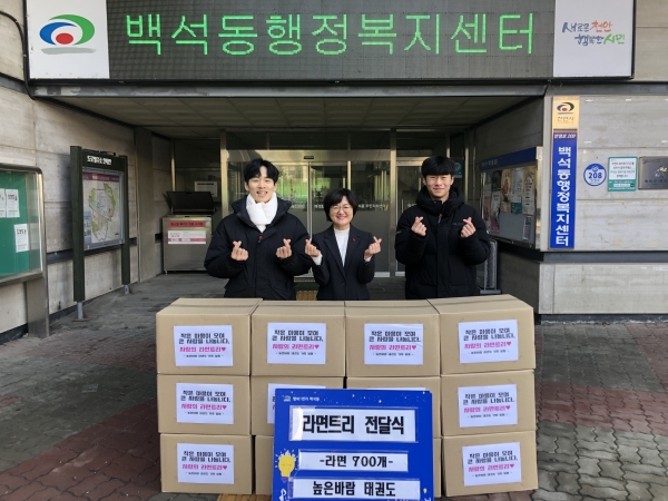 [세종타임즈] 높은바람 태권도장이 지난 27일 어려운 이웃에게 전달해 달라며 라면 900개를 천안시 백석동에 기탁했다.