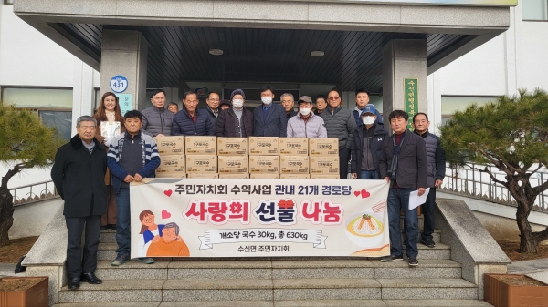 이관희 수신면장은 “이번 행사로 마을 어르신들이 따뜻하게 한해를 마무리하실 수 있을 것 같아 기쁘다”며 “2024년 갑진년에도 마을 주민들끼리 따뜻함을 나눌 수 있는, 정겨운 분위기의 수신면이 될 수 있도록 노력하겠다”고 전했다.