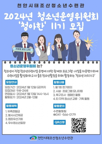 [세종타임즈] 천안시태조산청소년수련관은 오는 12일까지 자치기구 청소년운영위원회 ‘청아한’ 위원을 모집한다고 8일 밝혔다.