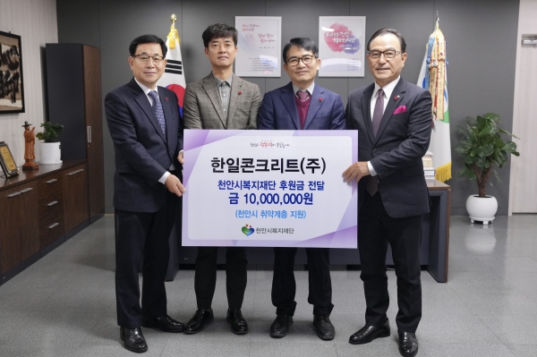 [세종타임즈] 한일콘크리트는 12일 천안시 아동 취약계층을 위해 사용해달라며 후원금 1,000만원을 천안시복지재단에 전달했다.