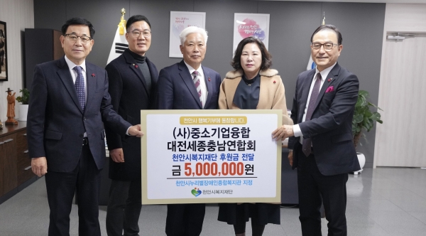 [세종타임즈] 중소기업융합 대전세종충남연합회는 16일 천안시 장애인 취약계층을 위해 사용해 달라며 후원금 500만원을 천안시복지재단에 전달했다.