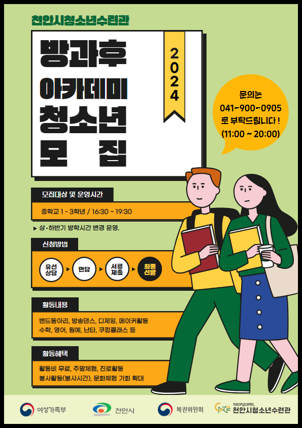 천안시청소년수련관 방과후아카데미는 중학교 1~3학년을 대상으로 방과후 돌봄이 필요한 청소년에게 체험활동, 학습지원, 급식 등의 종합서비스를 제공한다.