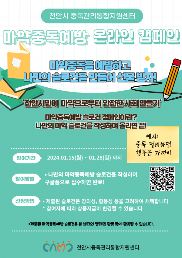 이번 캠페인은 시민들이 함께 마약 중독 예방에 대한 나만의 슬로건을 만들어 마약 폐해 예방을 위한 시민 참가 분위기를 확산하고 중독으로부터 안전한 천안시를 조성하기 위해 추진됐다.