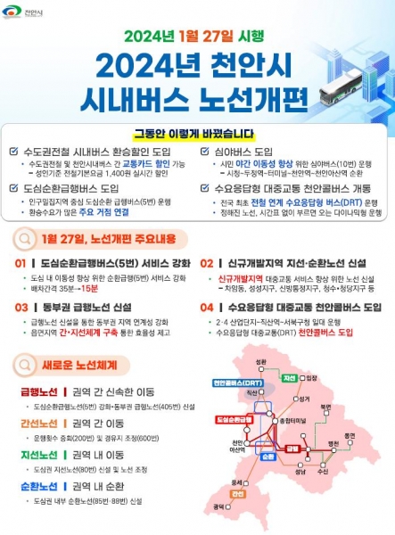 노선개편은 신규개발지역 지선·순환노선 신설, 도심순환급행버스 서비스 강화, 동부권 급행노선 신설, 수요응답형 대중교통 천안콜버스 확대운영 등을 골자로 한다.