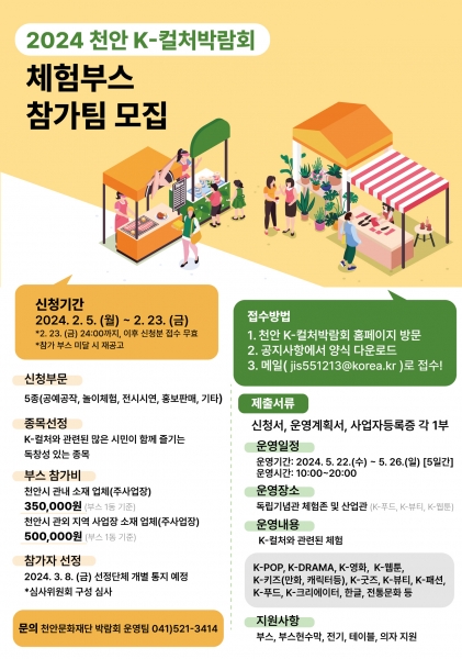[세종타임즈] 천안문화재단은 2월 5일부터 23일까지 ‘2024 천안 K-컬처박람회’ 전시·판매·체험 공간 참가자를 모집한다.