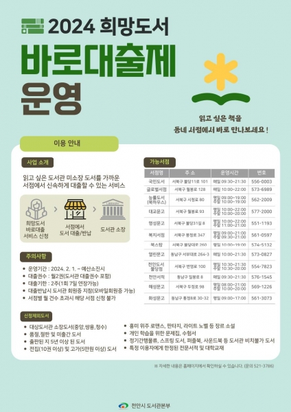 [세종타임즈] 천안시도서관본부는 이달부터 2024년 희망 도서 바로 대출제 서비스를 시행한다고 1일 밝혔다.