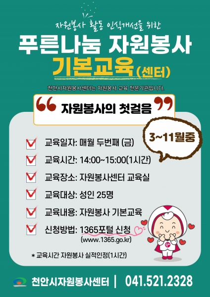 교육은 천안시자원봉사센터 전문교육강사가 진행한다.