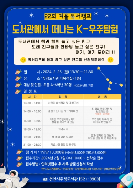 [세종타임즈] 천안시 두정도서관은 이번달 25일 초등학생 4~6학년을 대상으로 겨울 독서캠프 ‘도서관에서 떠나는 K-우주탐험’을 운영한다.