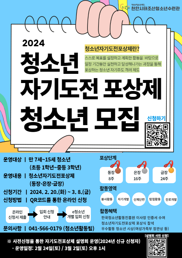 [세종타임즈] 천안시청소년재단 천안시태조산청소년수련관은 오는 3월 8일까지 2024년 청소년자기도전포상제 참가자를 모집한다.