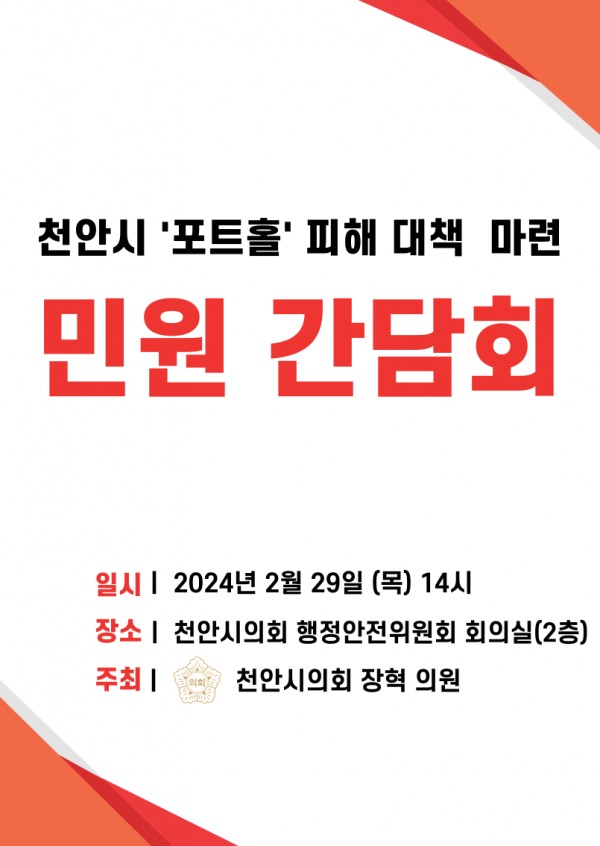 [세종타임즈] 천안시의회 장혁 의원은 29일 천안시의회 2층 행정안전위원회 회의실에서‘천안시 포트홀 피해 대책 마련 간담회’를 개최한다.