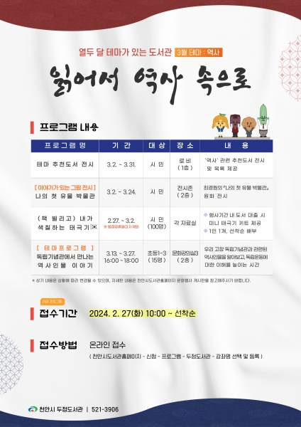 두정도서관 관계자는 “올바른 역사의식을 가지고 3.1절의 역사적 의미를 되새기는 의미 있는 한 달이 되기를 바란다”고 전했다.