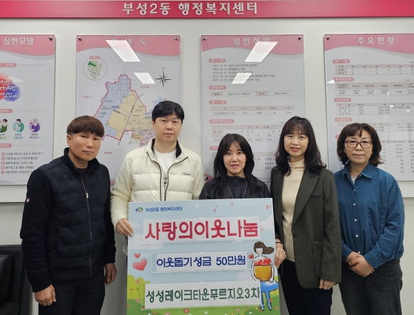 한편 성성레이크타운 푸르지오3차 입주민들은 21년부터 매년 부성2동 소외계층에게 이웃돕기 성금을 기탁하며 이웃사랑을 실천하고 있다.