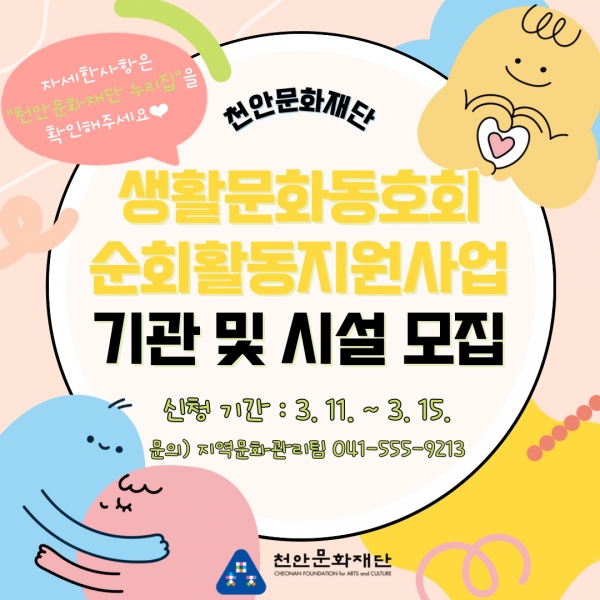 [세종타임즈] 천안문화재단은 생활문화 활동의 확대와 민간 문화시설 활성화를 위한 ‘2024년 생활문화동호회 순회 활동 지원’ 공모를 진행한다고 5일 밝혔다.