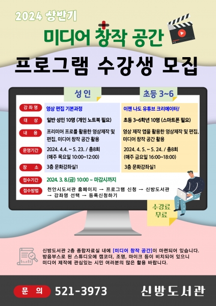 [세종타임즈] 천안시 신방도서관이 상반기 ‘미디어 창작 공간 프로그램’을 4월 4일부터 5월 24일까지 운영한다.