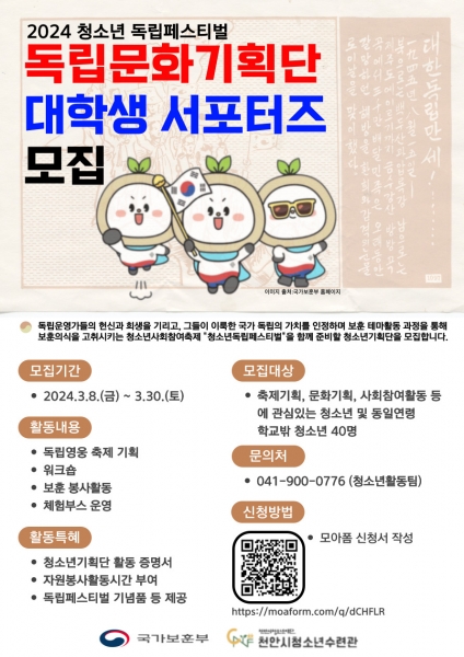 [세종타임즈] 천안시청소년재단은 천안시청소년수련관이 30일까지 ‘일상 속 살아있는 보훈, 독립은 축제다’ 프로그램 청소년 참가자를 모집한다고 밝혔다.