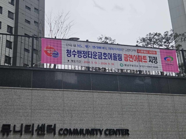 이번에 금연아파트로 지정된 청수행정타운금호어울림 아파트에는 현판과 현수막, 금연구역 안내표지가 지원된다.