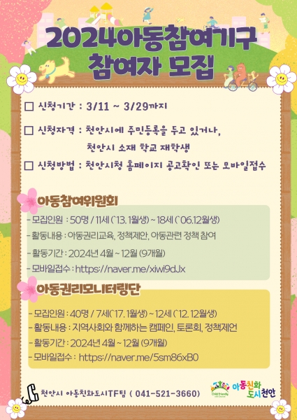 [세종타임즈] 천안시는 오는 29일까지 아동의 권리증진과 참여권 실현을 위한 아동참여위원회와 아동권리모니터링단 등 아동참여기구 참여자를 공개 모집한다.
