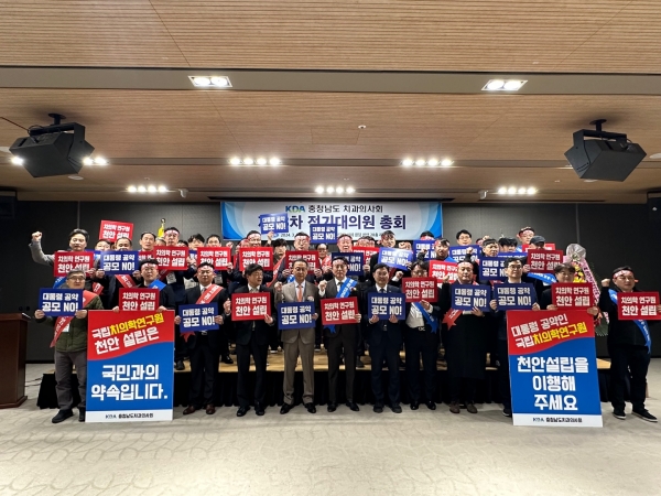 이날 의사회는 제73차 정기대의원 총회를 열고 ‘천안이 최적지, 정부는 약속을 즉각 이행하라’, ‘국립치의학연구원 천안 설립, 지금 당장 실천하라’ 등의 구호를 외치며 국립치의학연구원 천안 설립을 촉구했다.