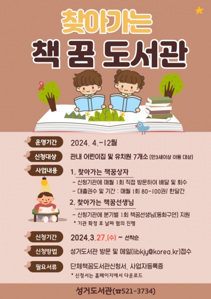 [세종타임즈] 천안시 성거도서관은 4월부터 어린이집·유치원을 대상으로 ‘찾아가는 책꿈 도서관’을 운영한다고 25일 밝혔다.