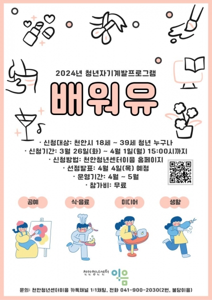 시 관계자는 “청년들이 다양한 분야에서 자기계발을 통해 성장을 이루길 바라며 추후 불당 이음, 안서 이음에서 배워유 프로그램을 추가 운영 할 예정이니 지속적인 관심을 부탁드린다”고 전했다.