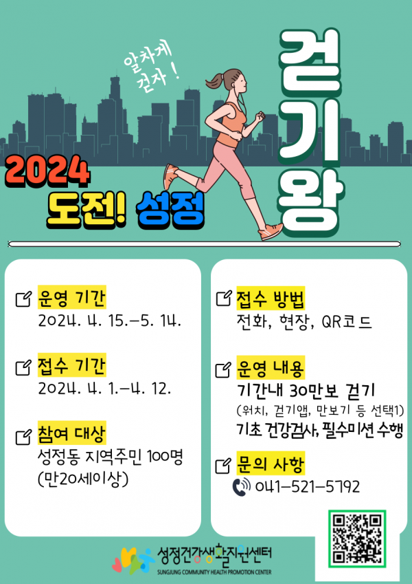 [세종타임즈] 천안시 서북구보건소 성정건강생활지원센터는 오는 15일부터 성정동 지역주민을 대상으로 규칙적인 신체활동 실천 기회를 제공하고자 ‘2024 도전 성정 걷기왕’을 운영한다.