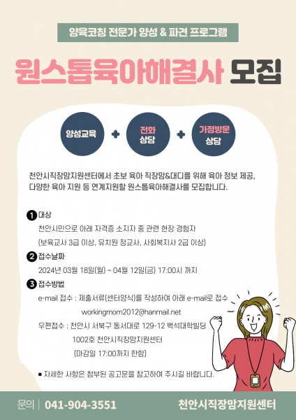 육아해결사 모집 지원대상은 천안시민으로 보육교사 3급 이상, 유치원 정교사, 사회복지사 2급 이상 등 관련 자격증 소지자 중 현장 경험이 있는 자이다.