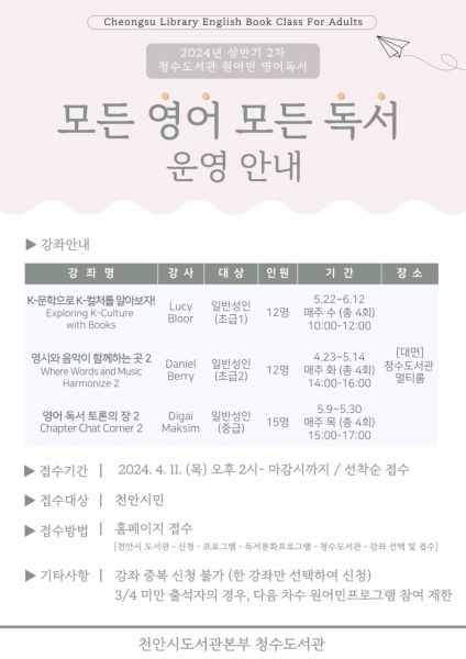 [세종타임즈] 천안시 청수도서관은 6월까지 일반 성인을 대상으로 상반기 2차 ‘모든 영어 모든 독서’ 프로그램을 운영한다고 8일 밝혔다.