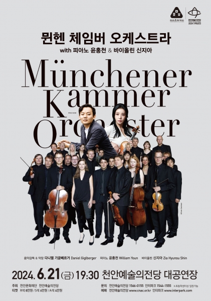 [세종타임즈] 천안문화재단은 6월 21일 저녁 19시 30분 천안예술의전당 대공연장에서 2024 기획공연 ‘뮌헨 체임버 오케스트라 with 피아니스트 윤홍천, 바이올리니스트 신지아’를 개최한다고 19일 밝혔다.