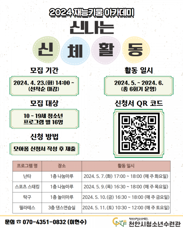 [세종타임즈] 천안시청소년재단 천안시청소년수련관은 2024년 재능키움 아카데미 청소년 방과 후 신체활동 프로그램 ‘신나는 신체활동’ 참가자를 모집한다고 22일 밝혔다.
