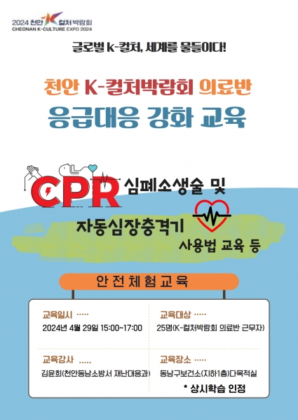한편 동남구보건소는 ‘천안 K-컬처 박림회’의 성공적인 개최 및 관람객의 안전관리를 위해 매년 심폐소생술 및 자동심장충격기 사용법 등 안전 체험교육을 통해 응급처치 능력을 강화해 나갈 계획이다.